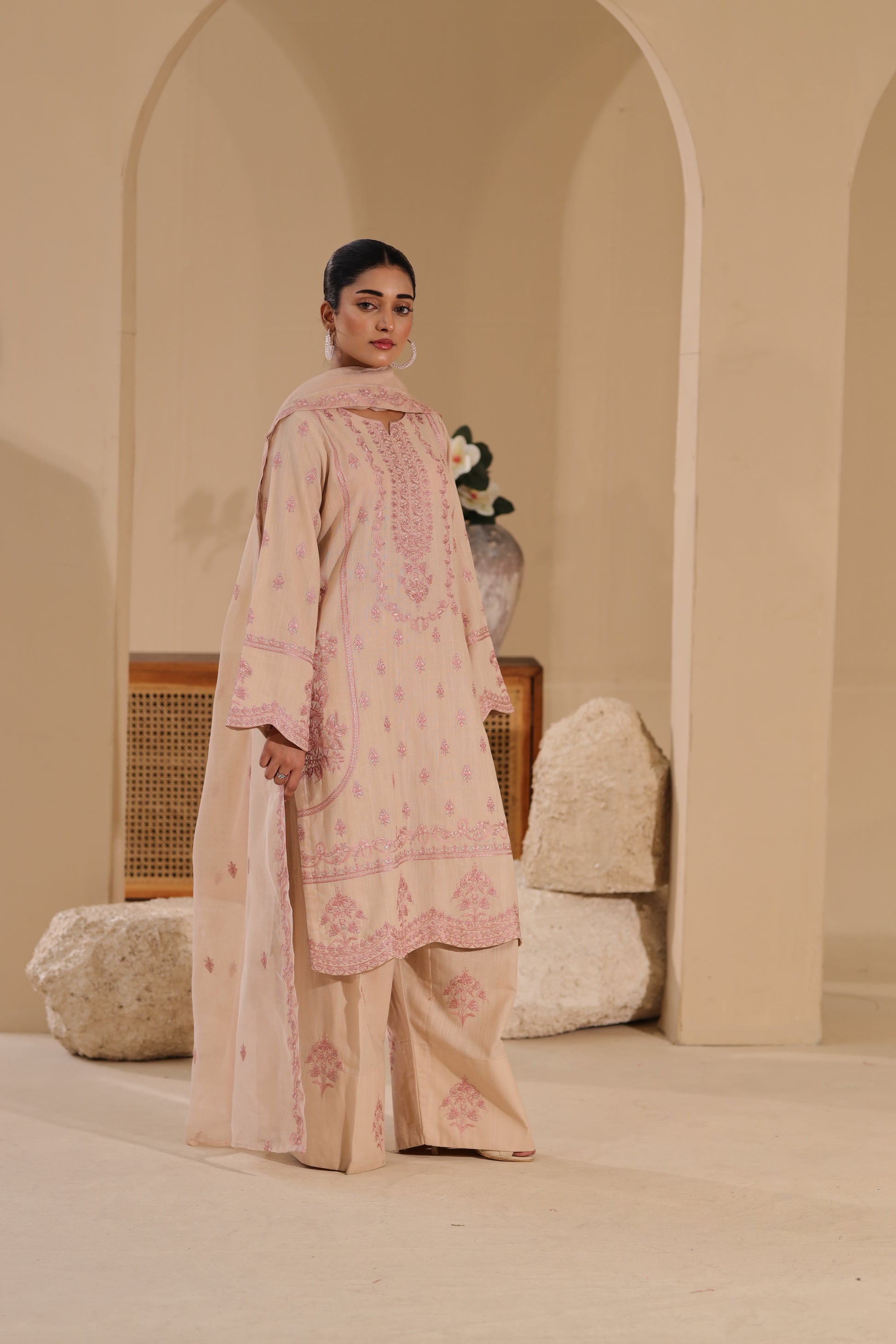 Elevate your winter look with this khaddar embroidered shirt, paired with a cotton net embroidered dupatta and khaddar embroidered Shalwar. Rich in detail and crafted for warmth, this ensemble beautifully combines luxury, comfort, and timeless elegance — perfect for the winter season.