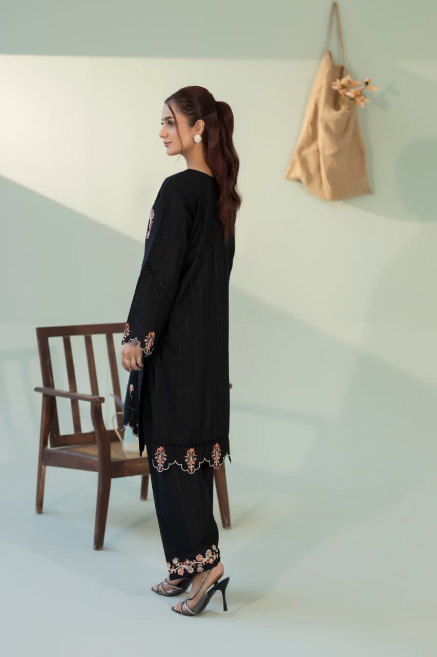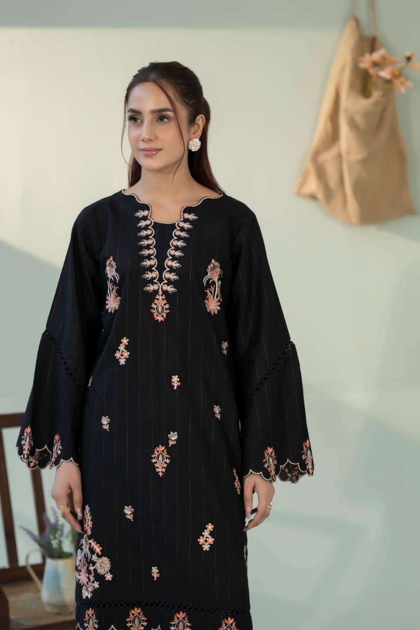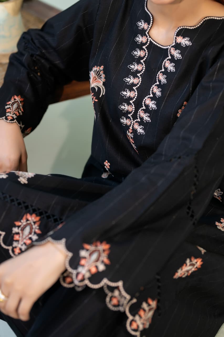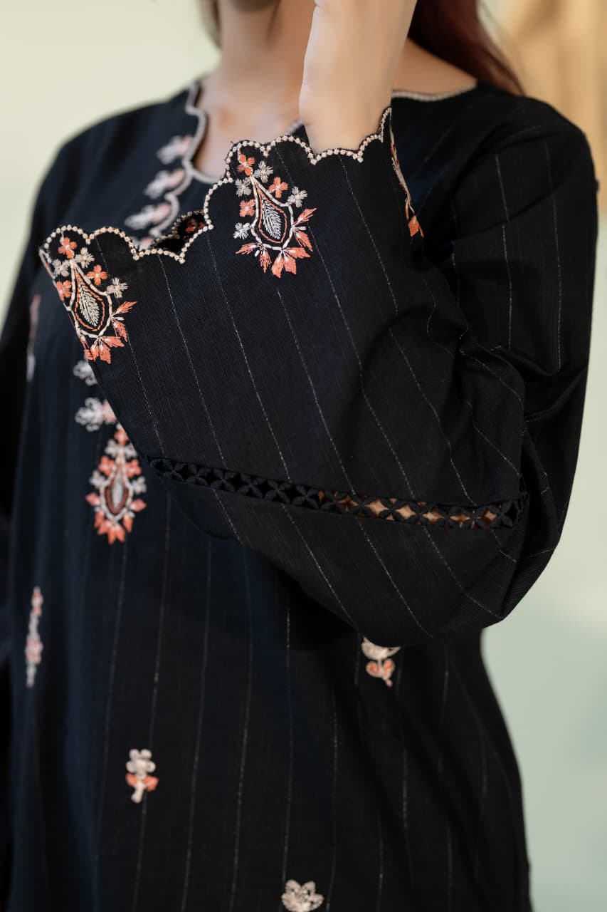 Embrace winter elegance with this khaddar embroidered shirt, paired with a beautifully crafted embroidered shalwar. The intricate detailing and cozy fabric make it a perfect blend of style, comfort, and timeless charm for the season.