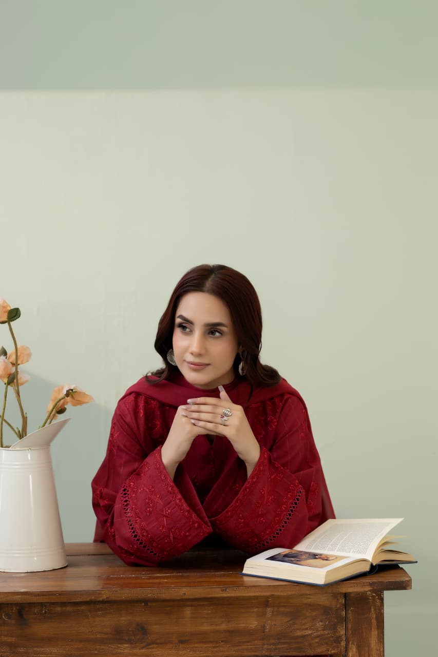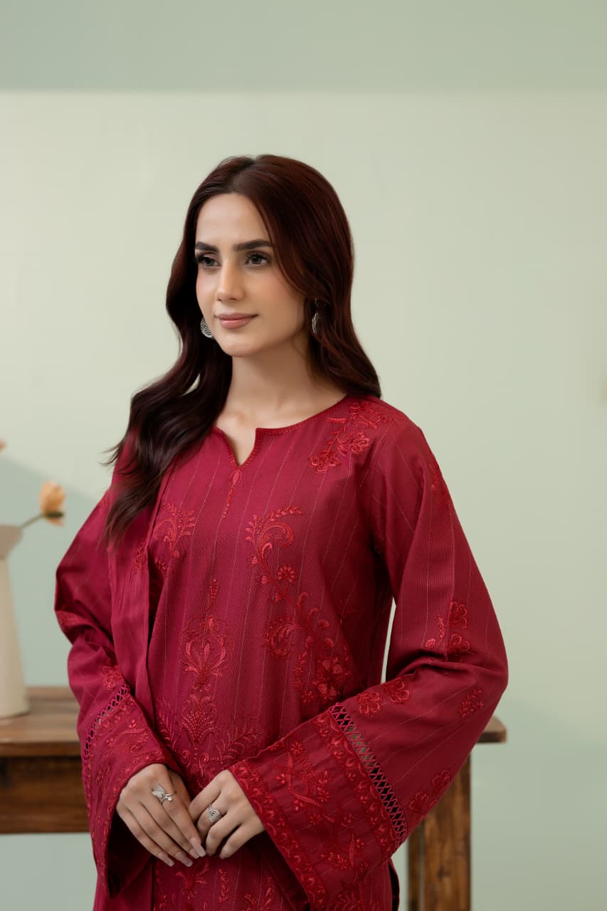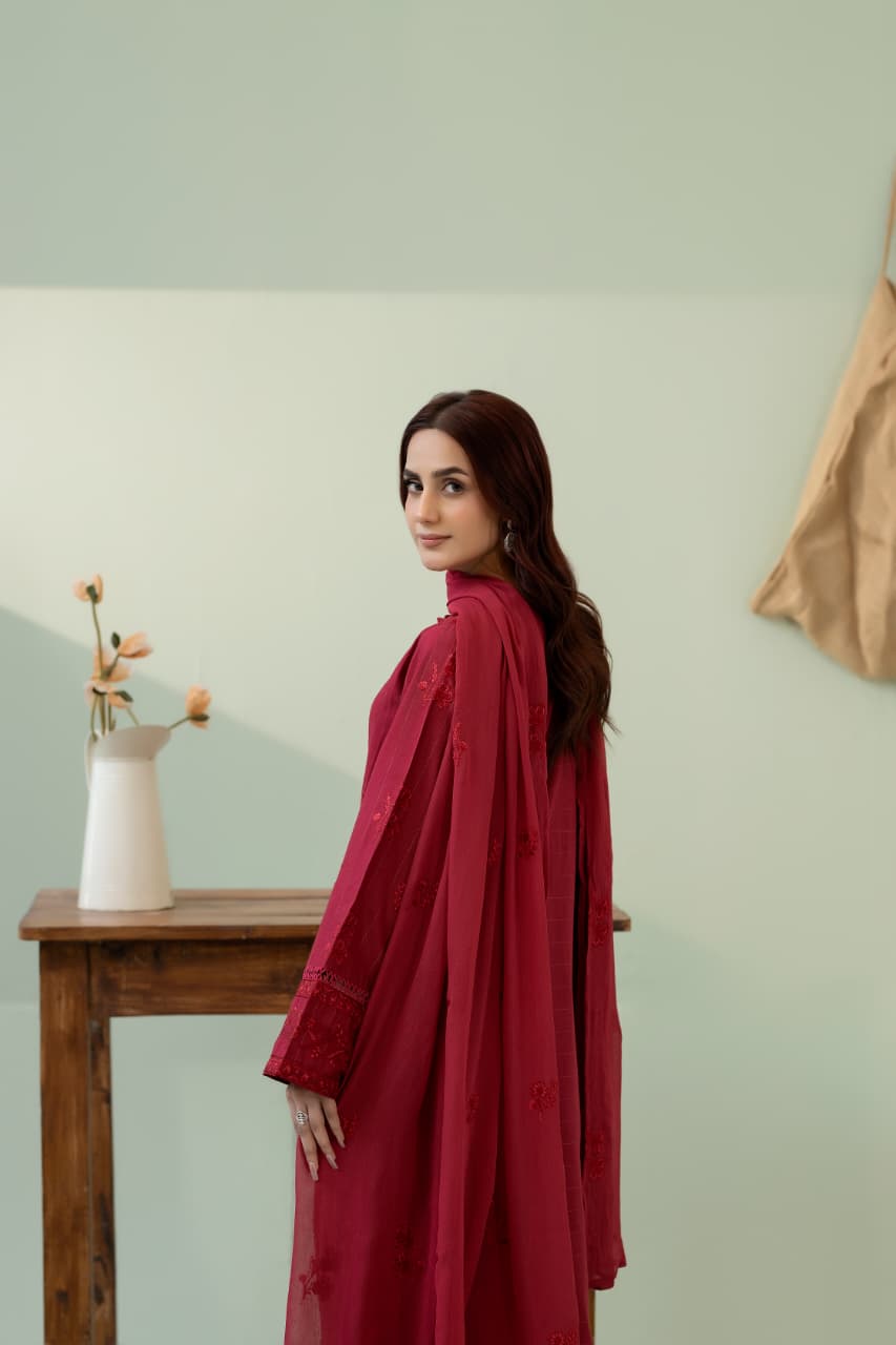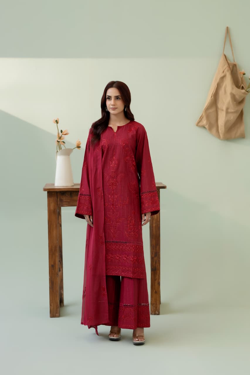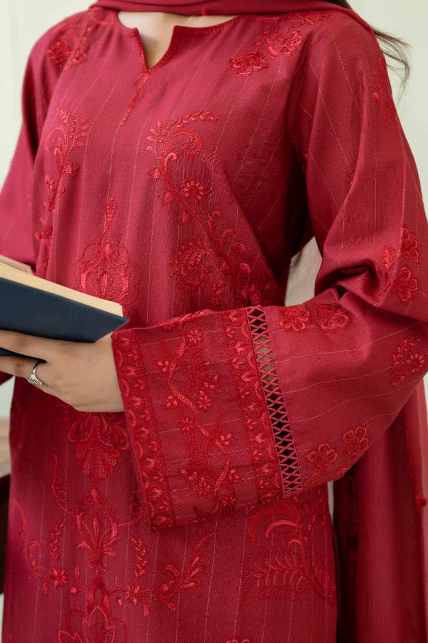 Experience timeless elegance with this khaddar embroidered ensemble, featuring a beautifully detailed embroidered shirt, paired with a delicate chiffon embroidered dupatta and embroidered khaddar trouser. Perfect for cozy winter days, this outfit blends warmth, sophistication, and effortless style.