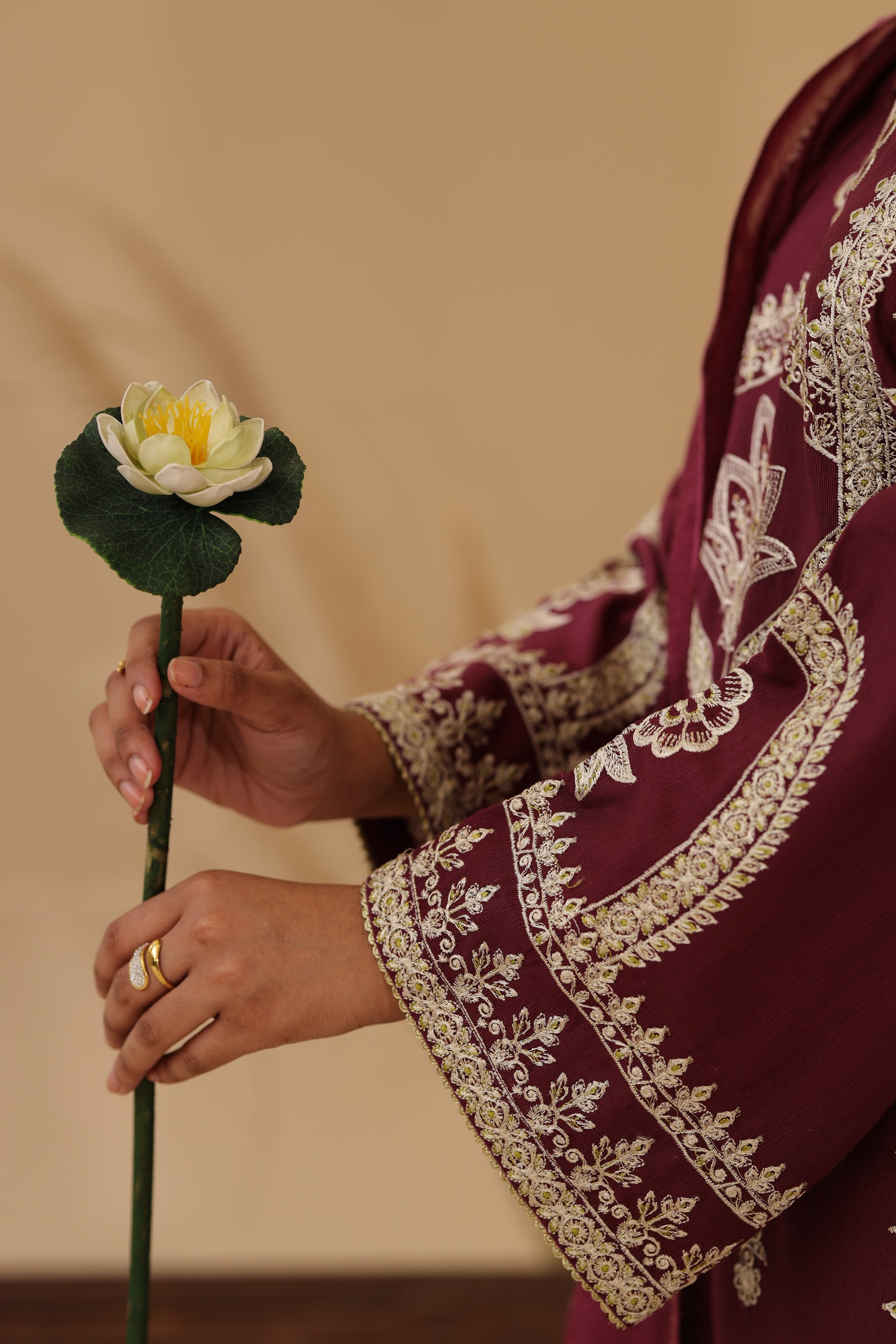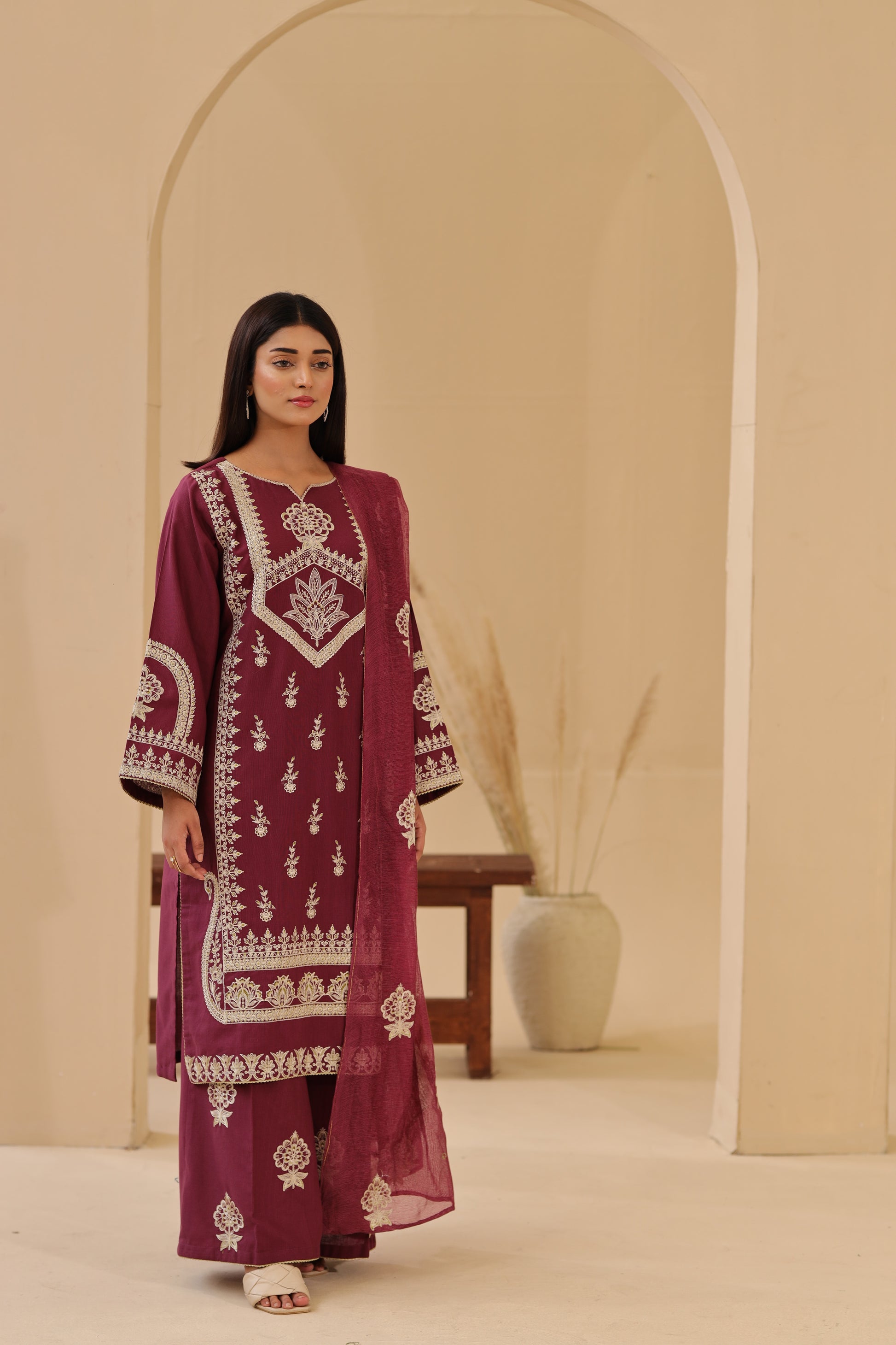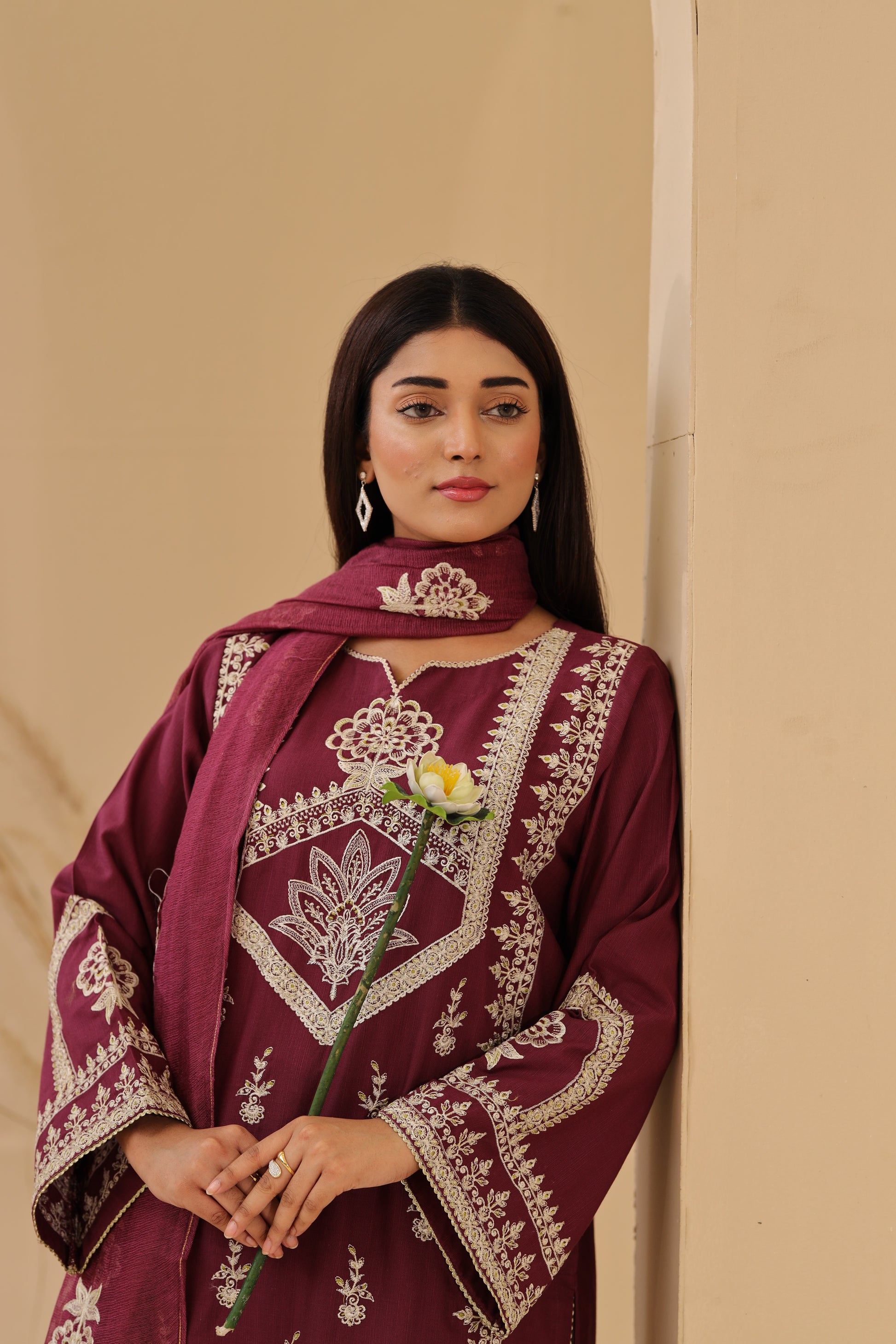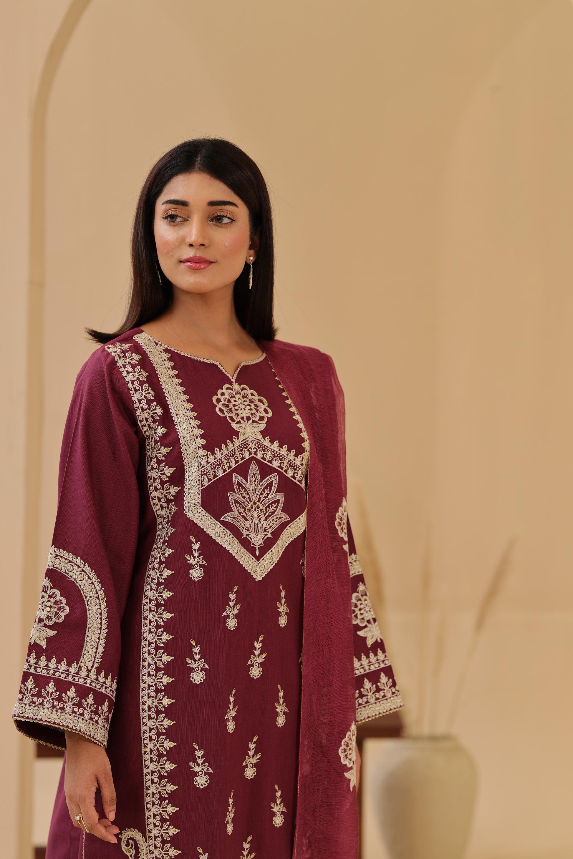 Elevate your winter look with this khaddar embroidered shirt, paired with a cotton net embroidered dupatta and khaddar embroidered trouser. Rich in detail and crafted for warmth, this ensemble beautifully combines luxury, comfort, and timeless elegance — perfect for the winter season.