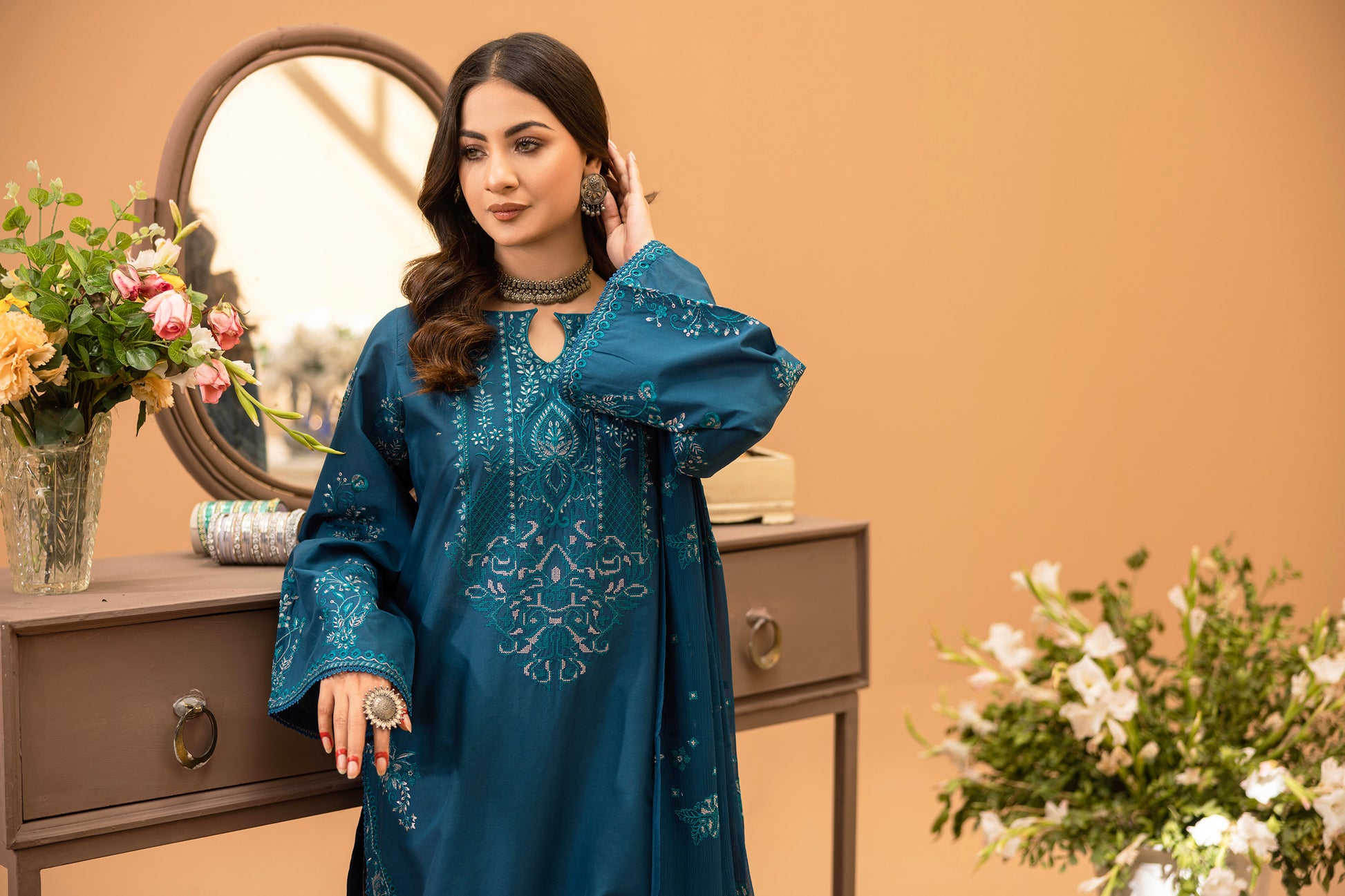 For the fashion-forward woman, NOOR offers a collection that combines style and comfort. Our 3 piece suits are made from the highest quality cotton cambric for a soft, luxurious feel. Complete the look with our crinckle embroidered dupatta and trouser and elevate your wardrobe with these versatile pieces.