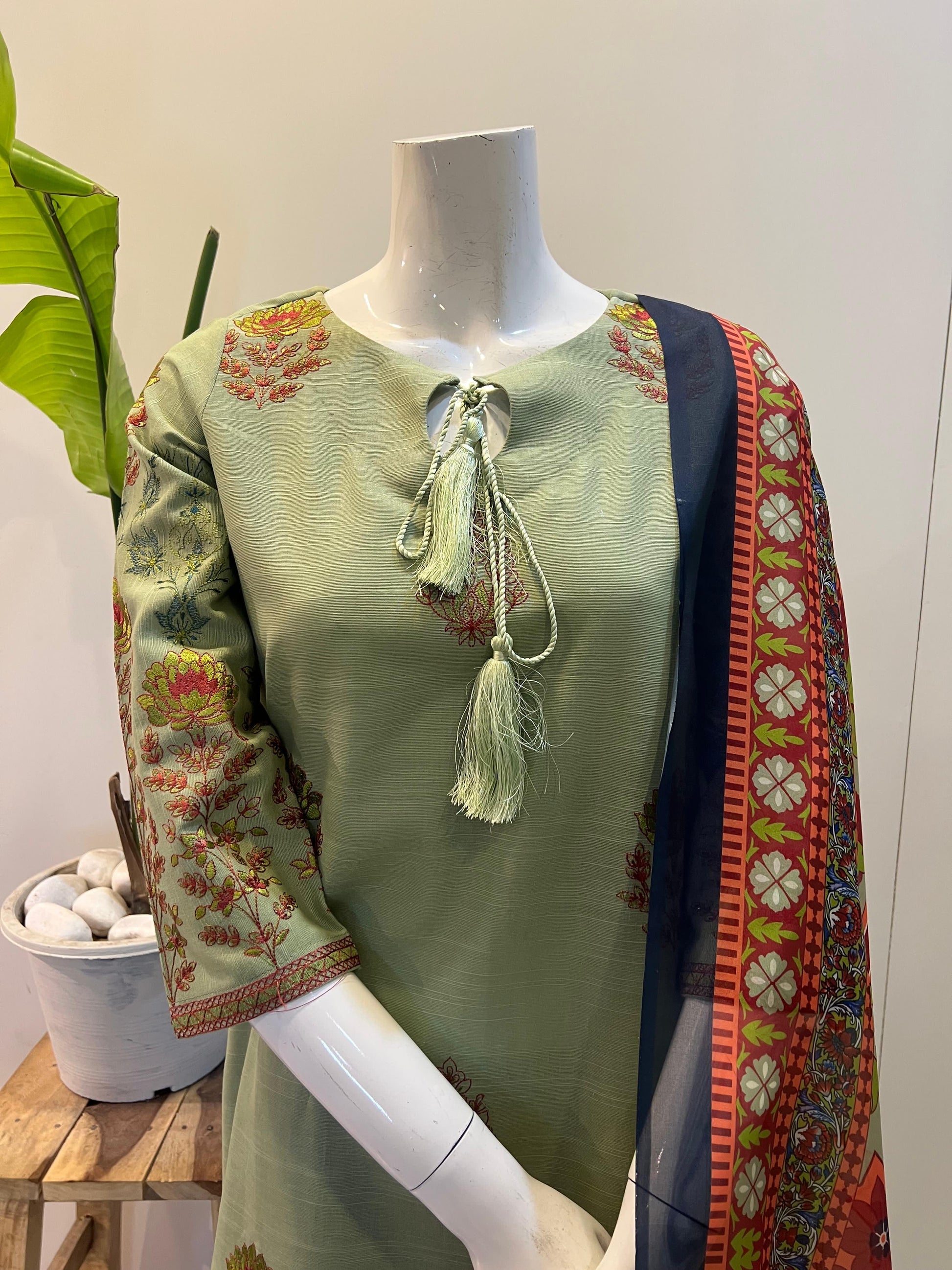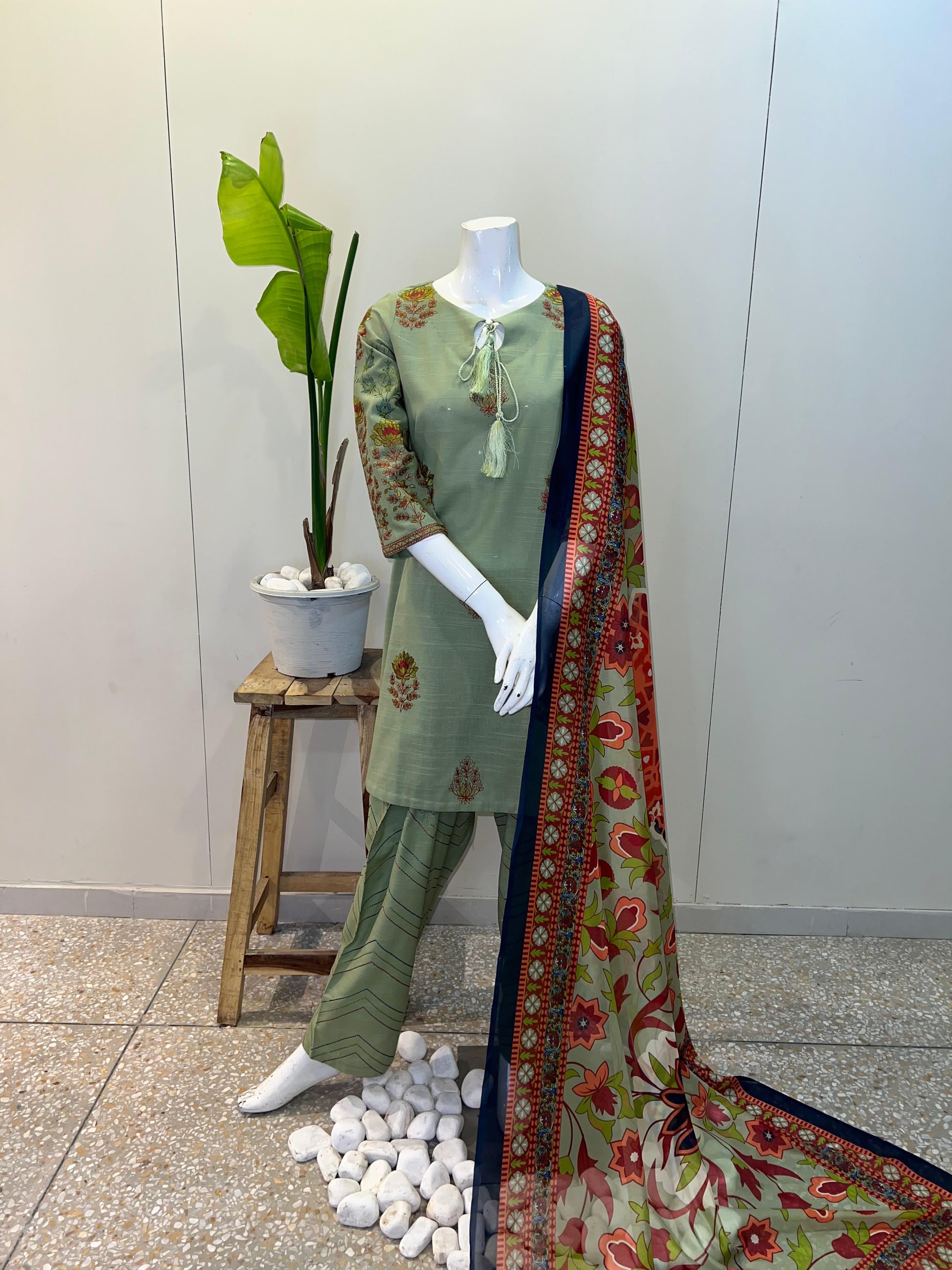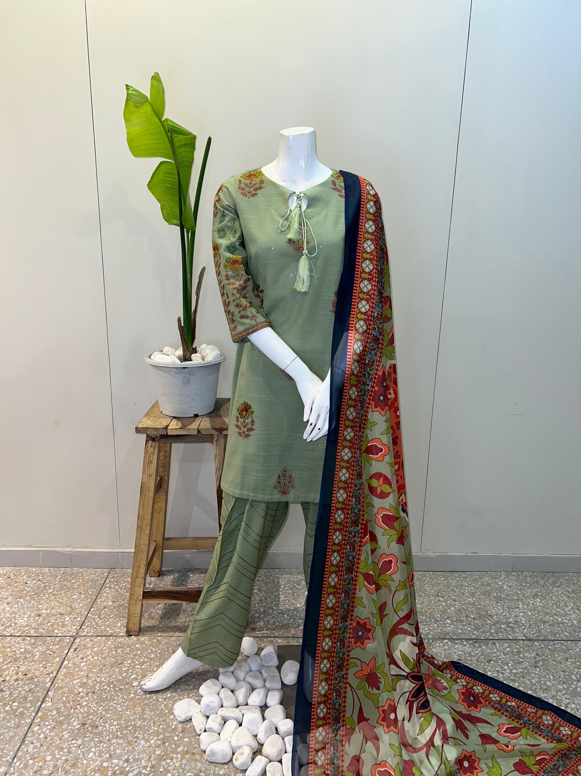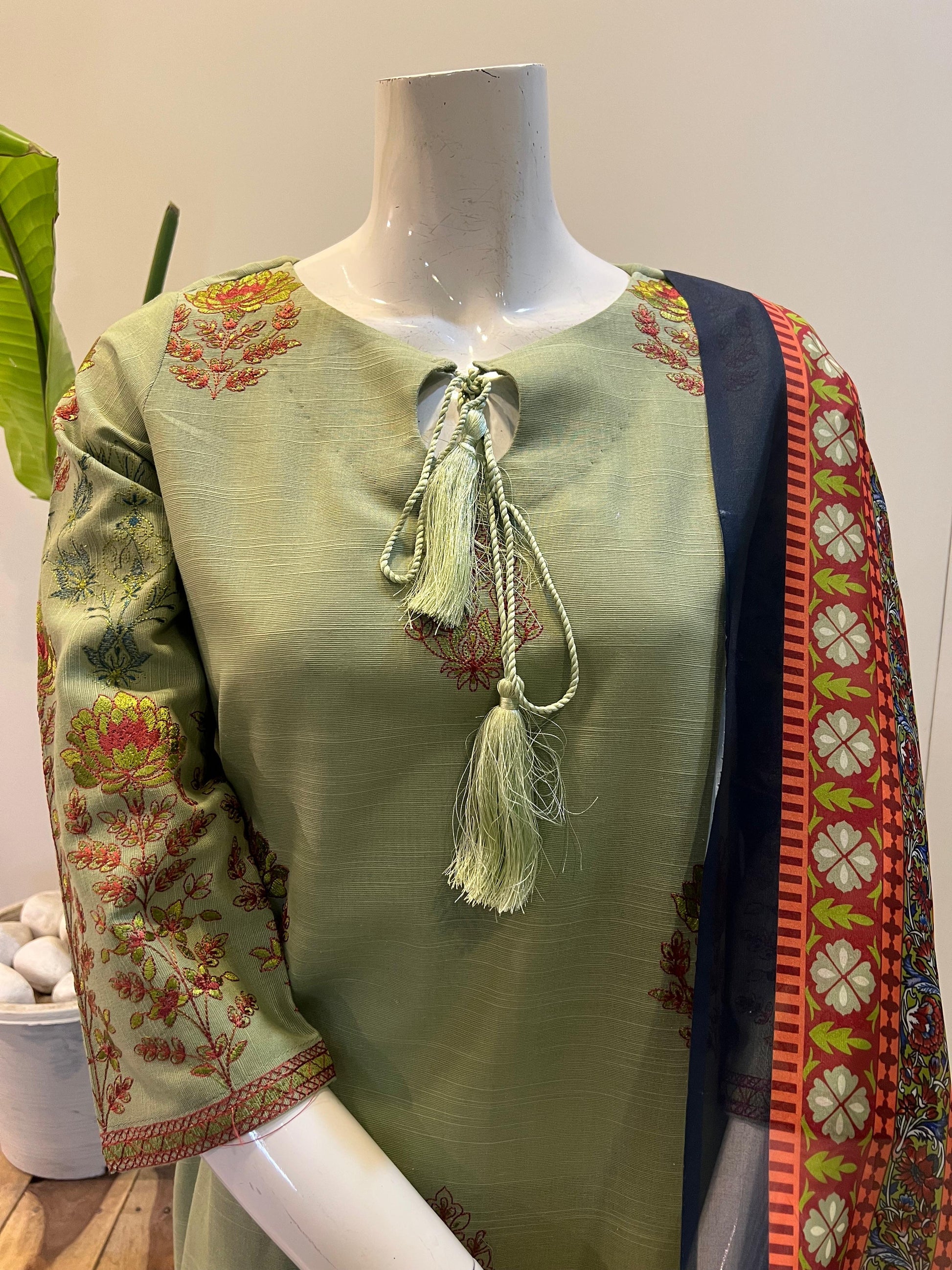 khaddar Embroidered shirt, shalwar with silk dupatta
