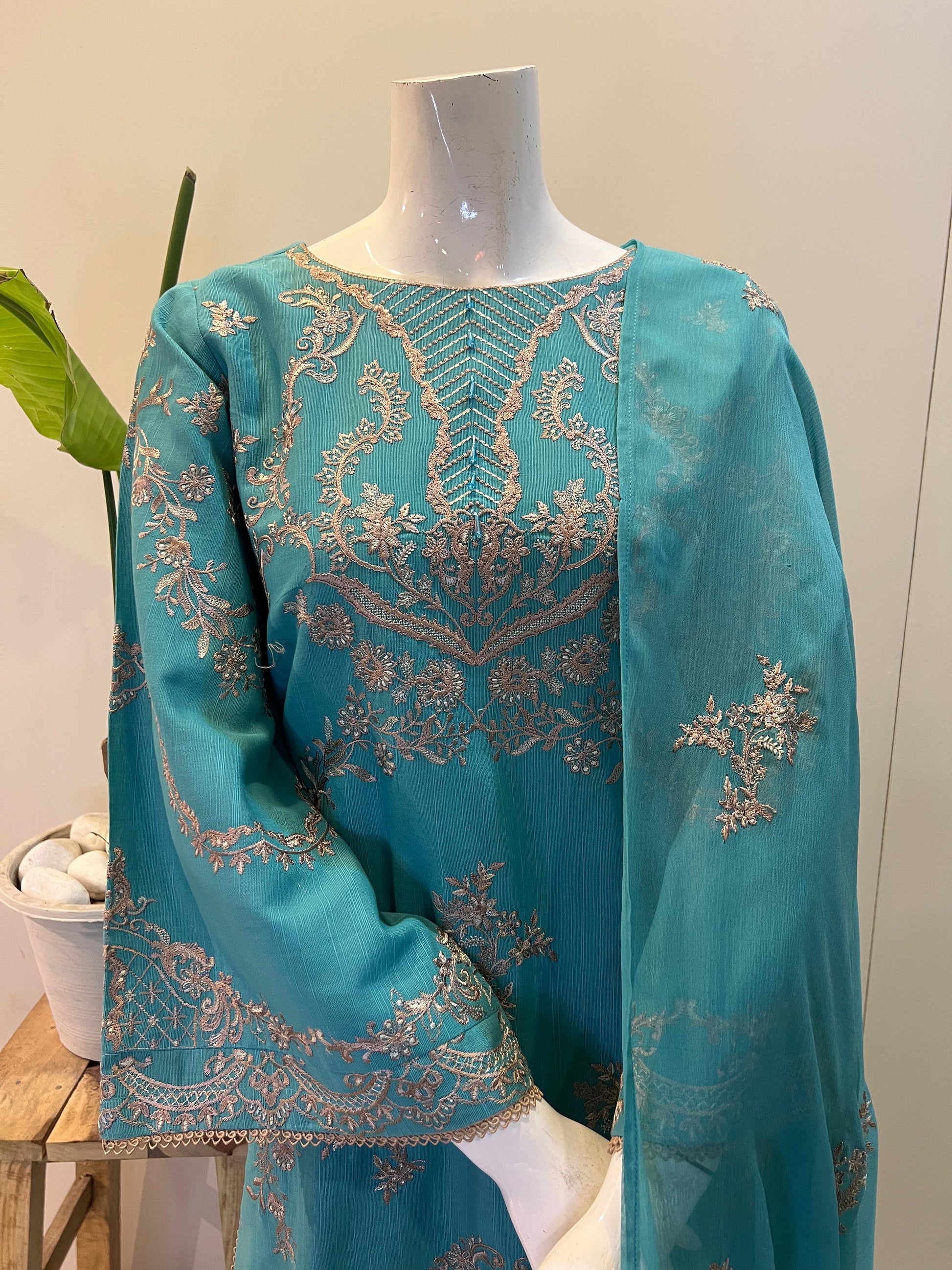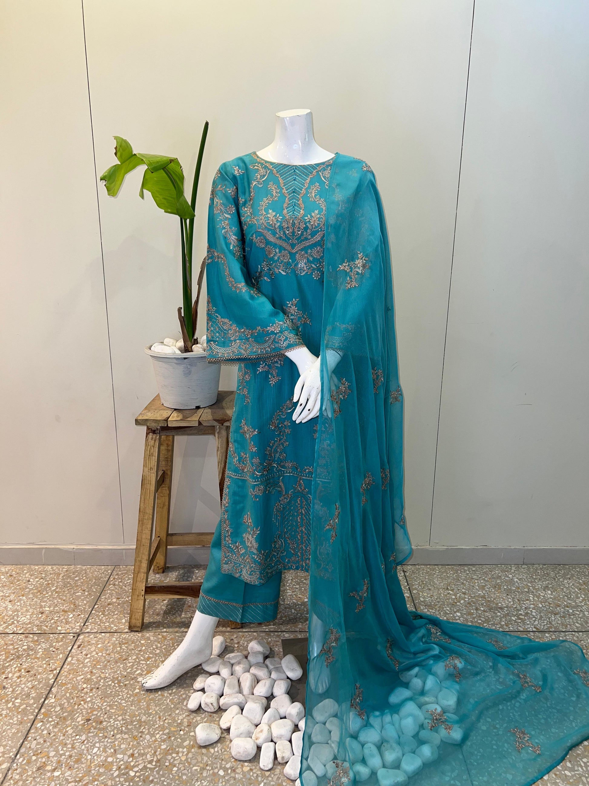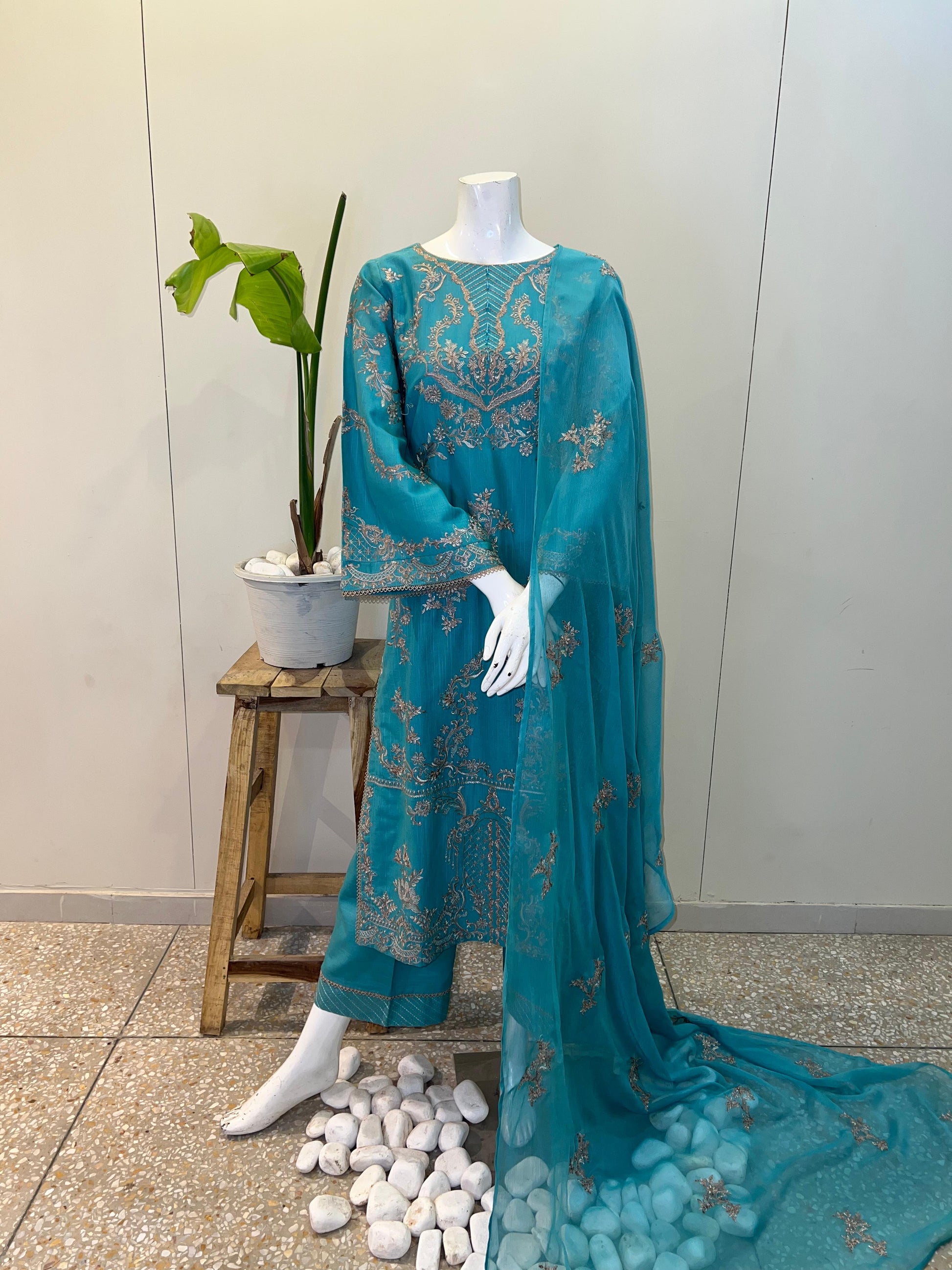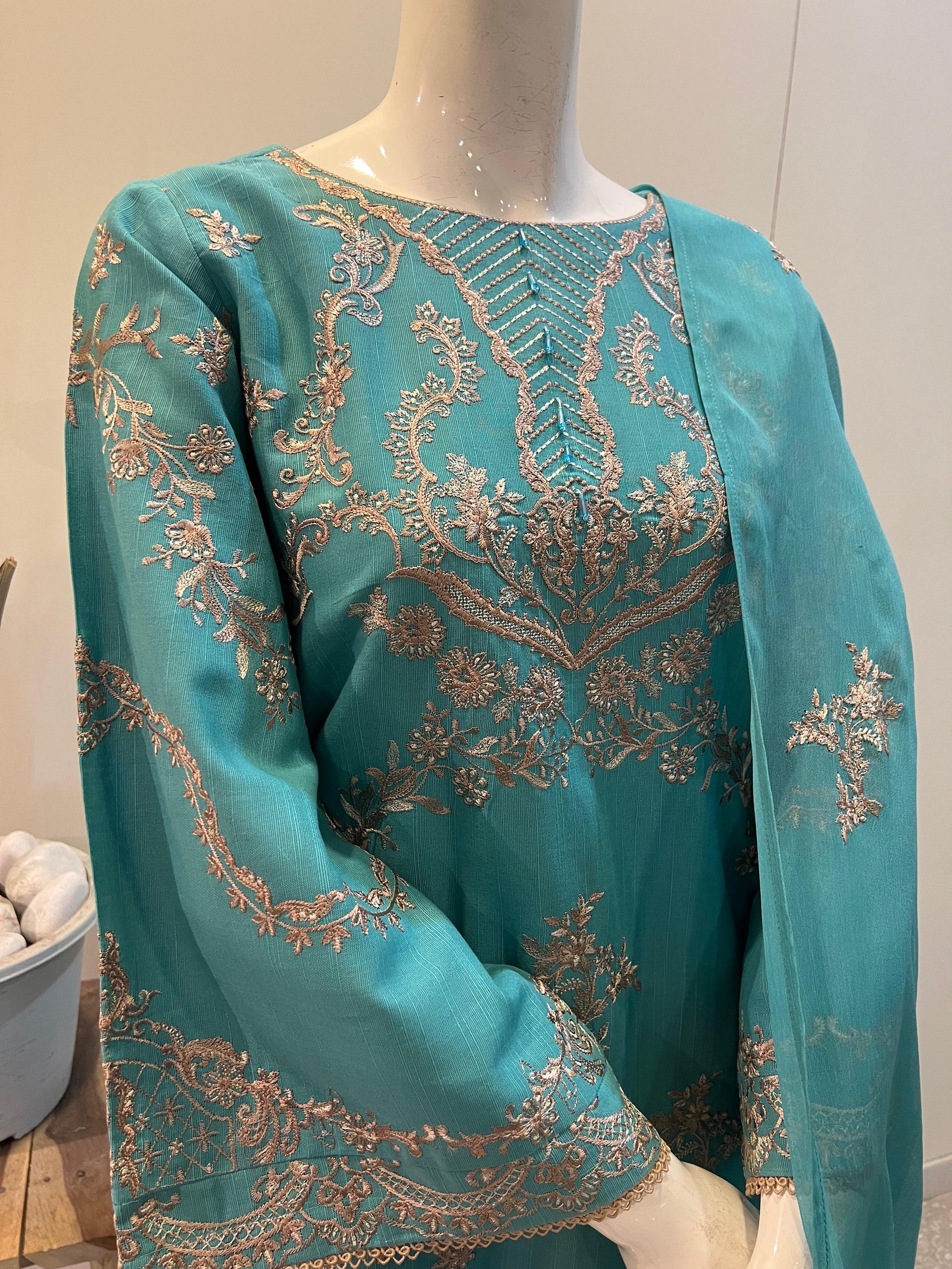 khaddar Embroidered shirt, trouser with chiffon dupatta
