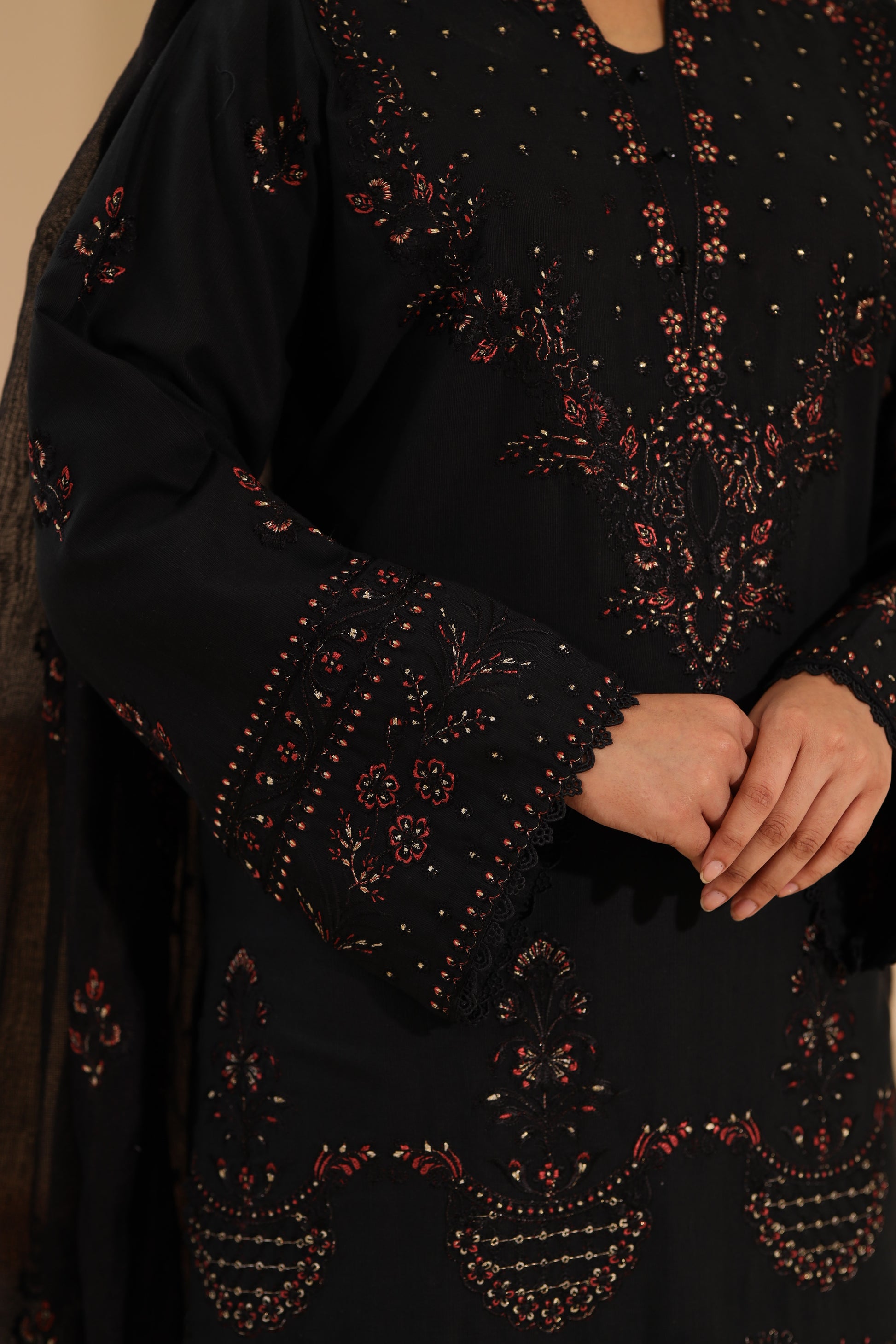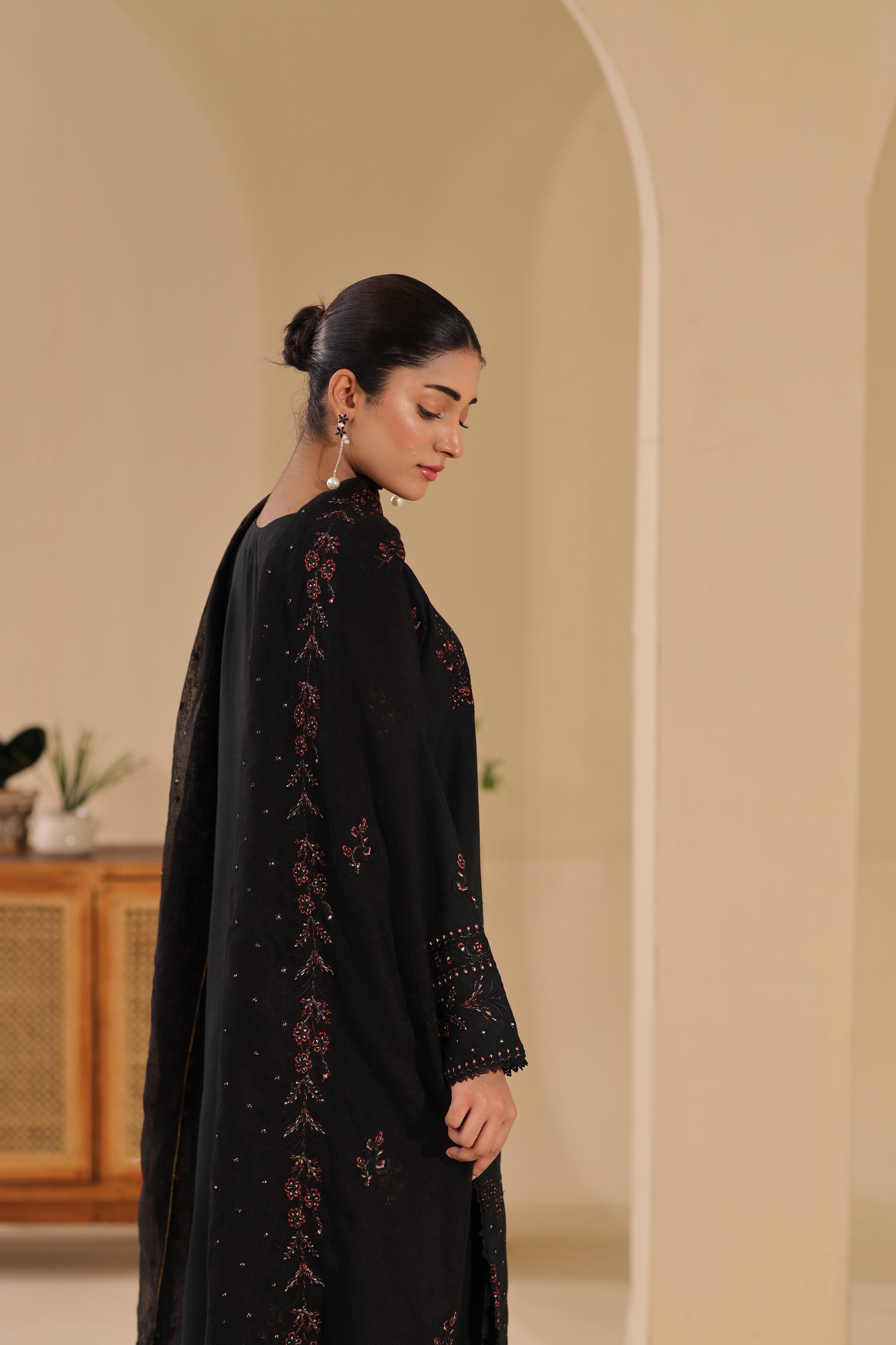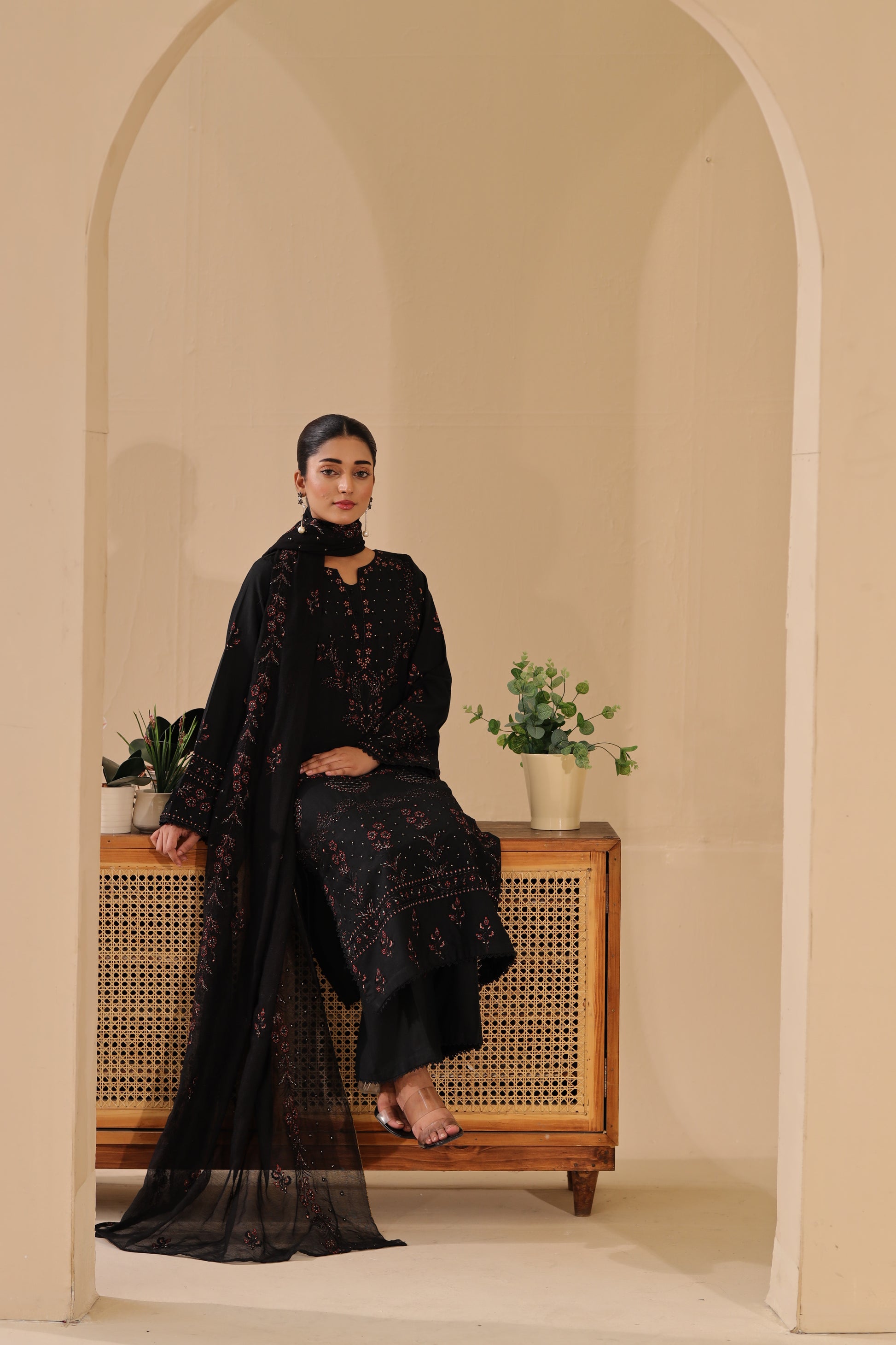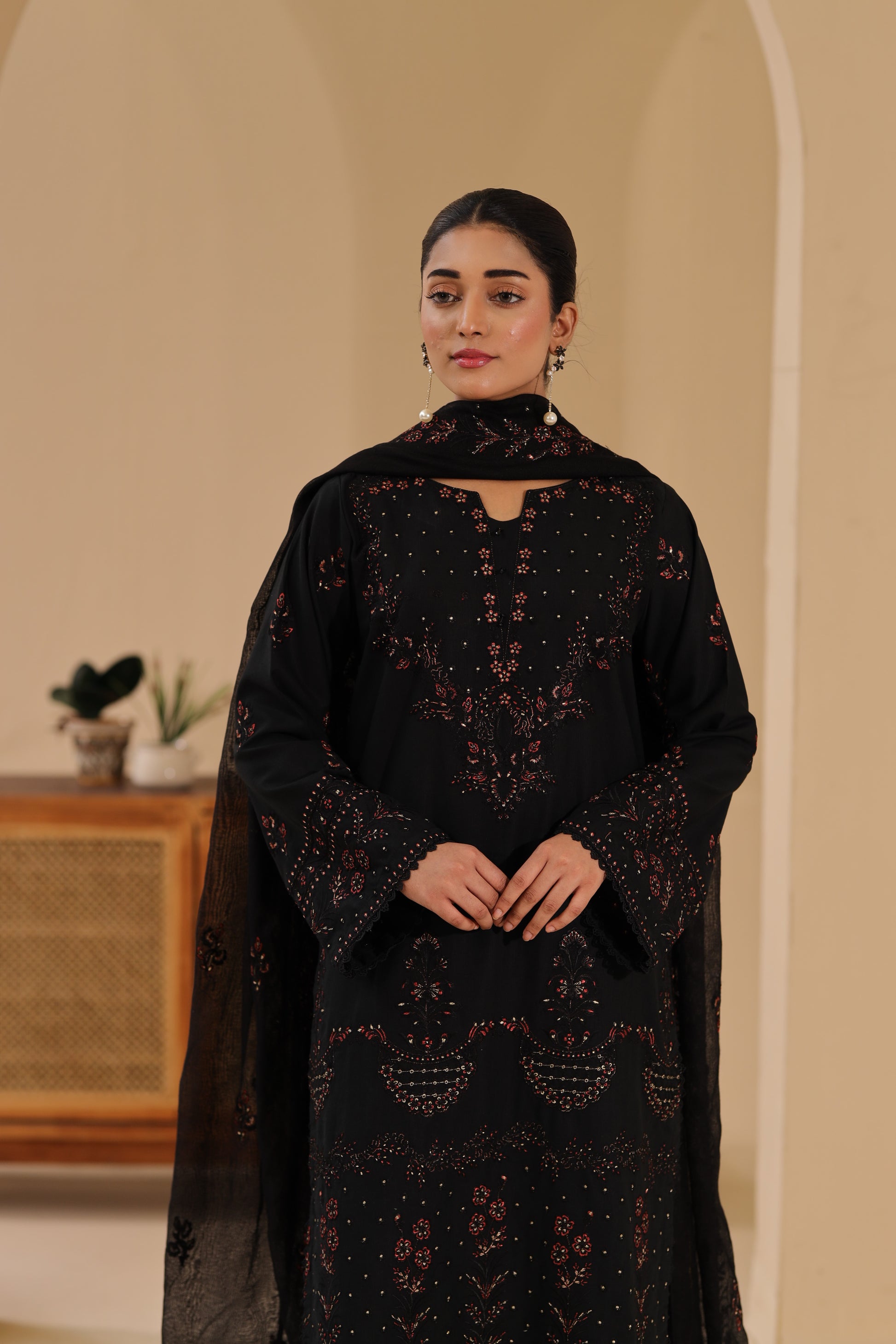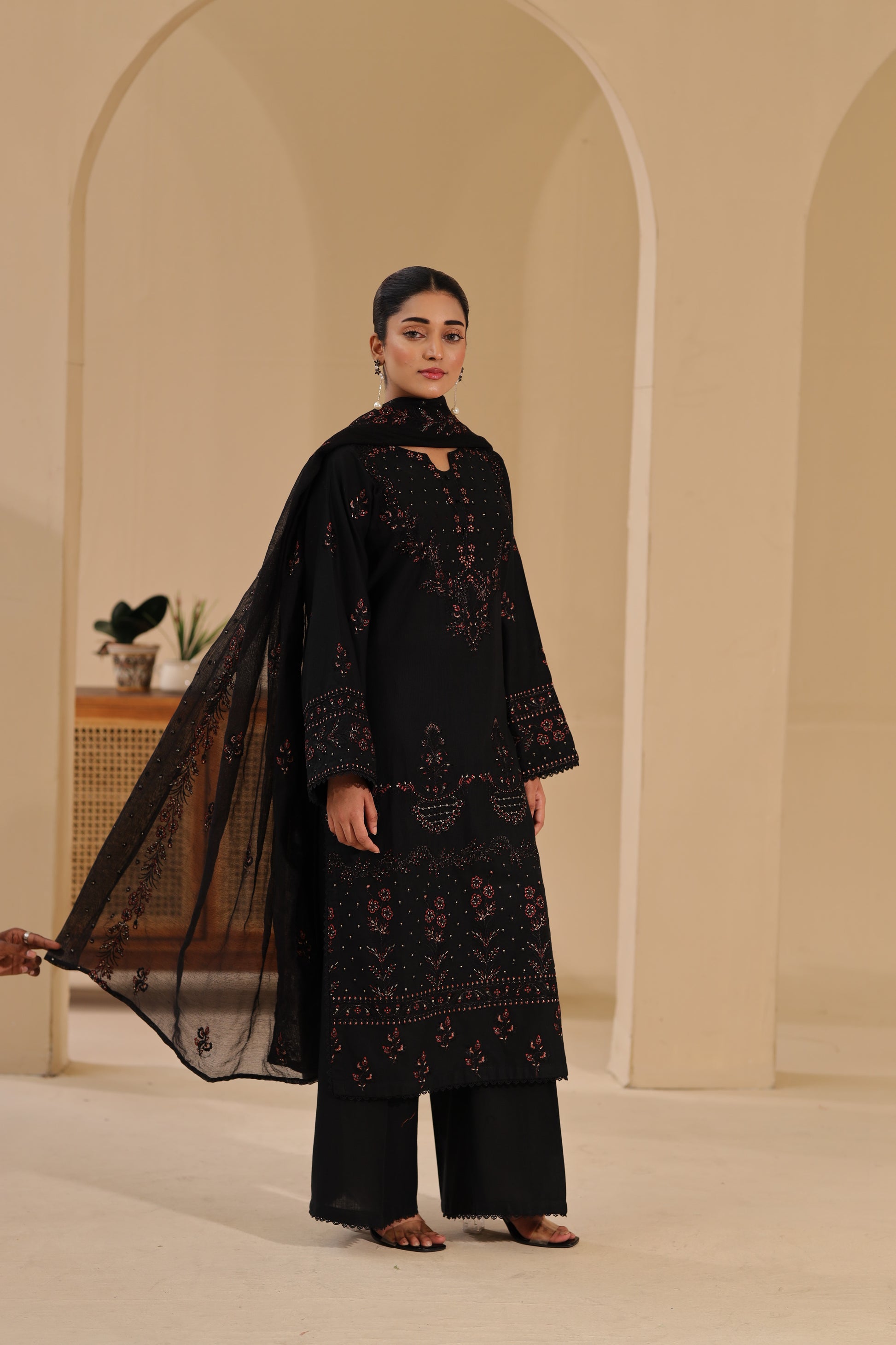 Elevate your winter look with this khaddar embroidered shirt, paired with a cotton net embroidered dupatta and Plain khaddar trouser. Rich in detail and crafted for warmth, this ensemble beautifully combines luxury, comfort, and timeless elegance — perfect for the winter season.