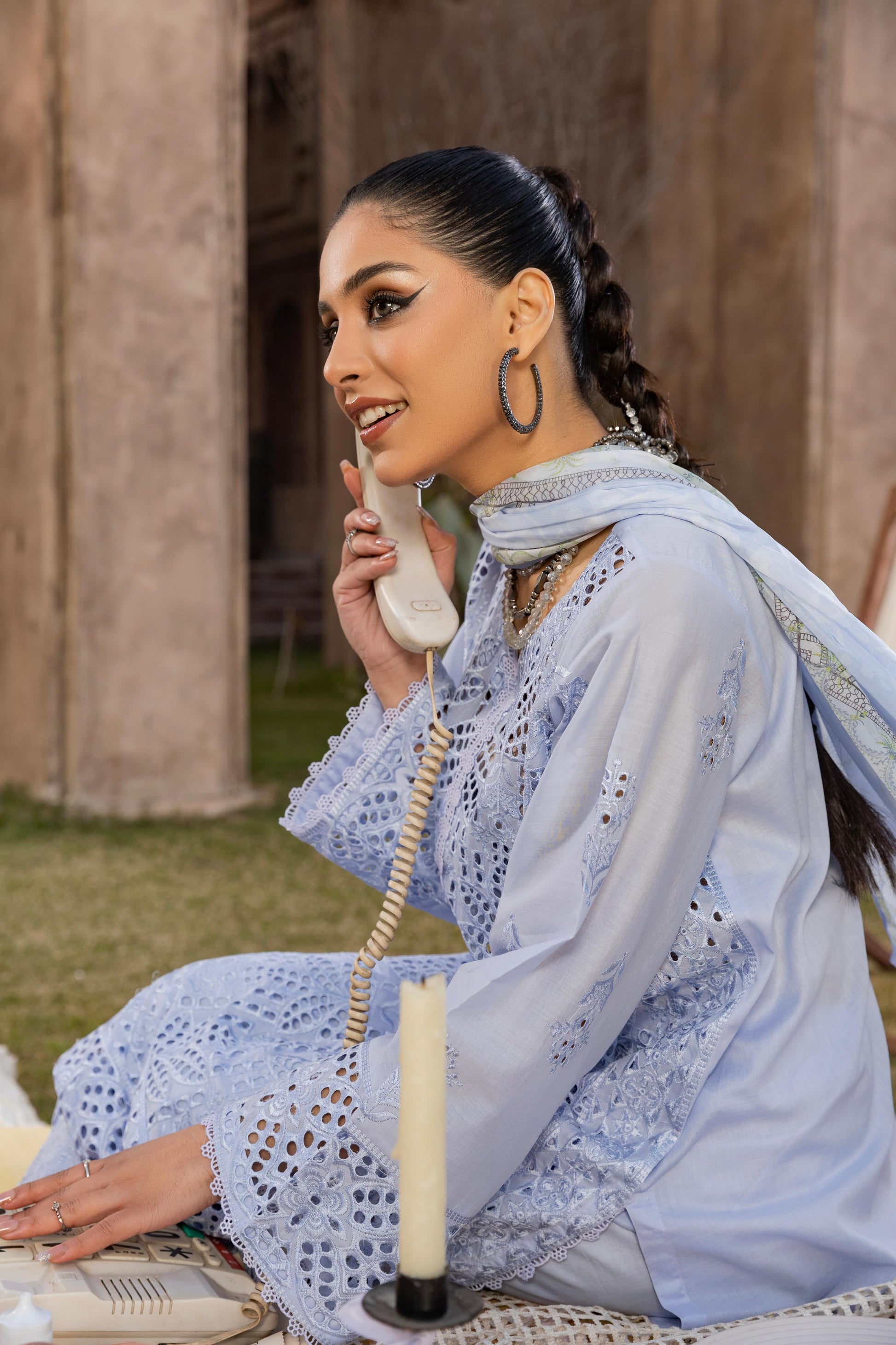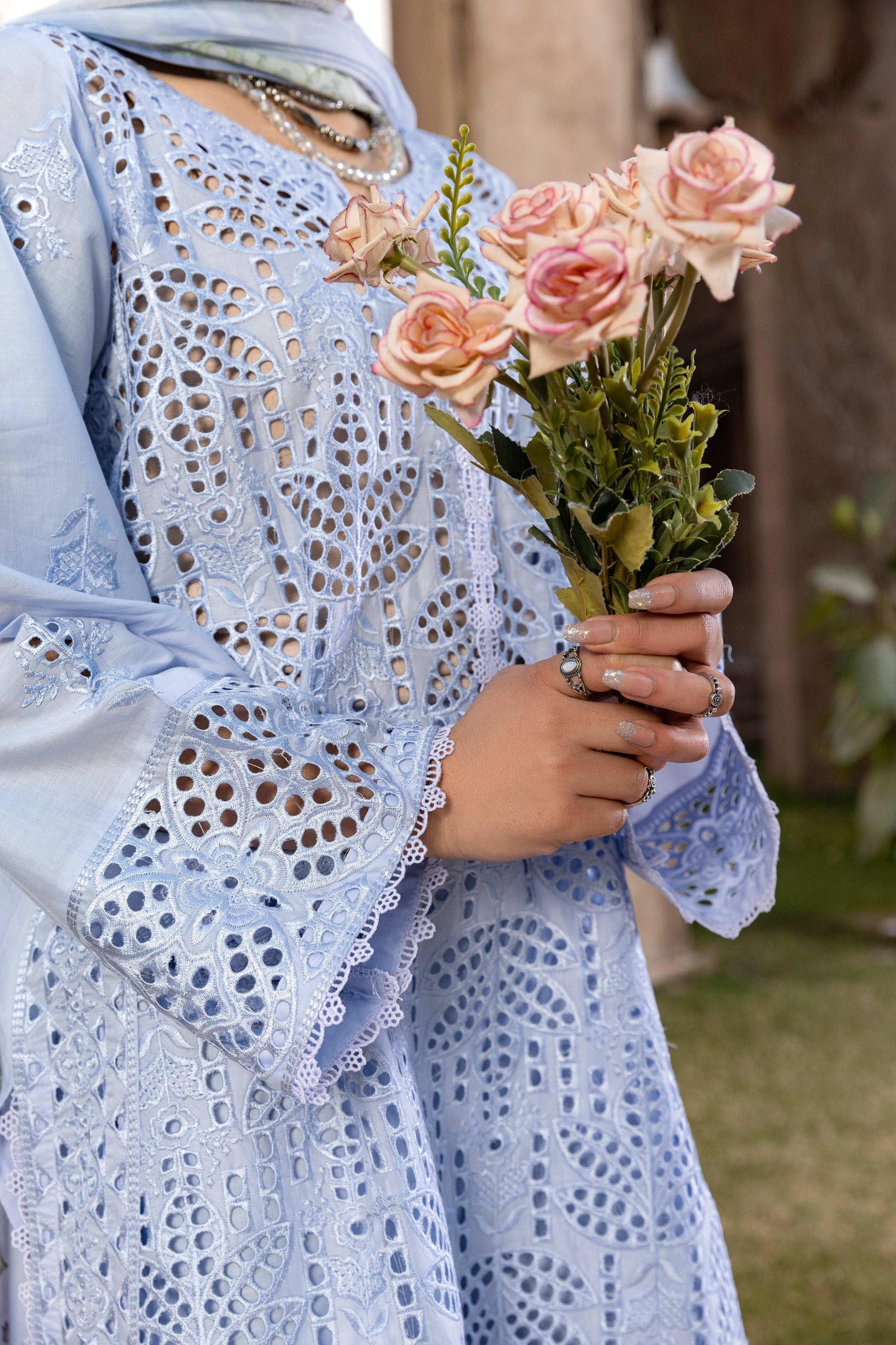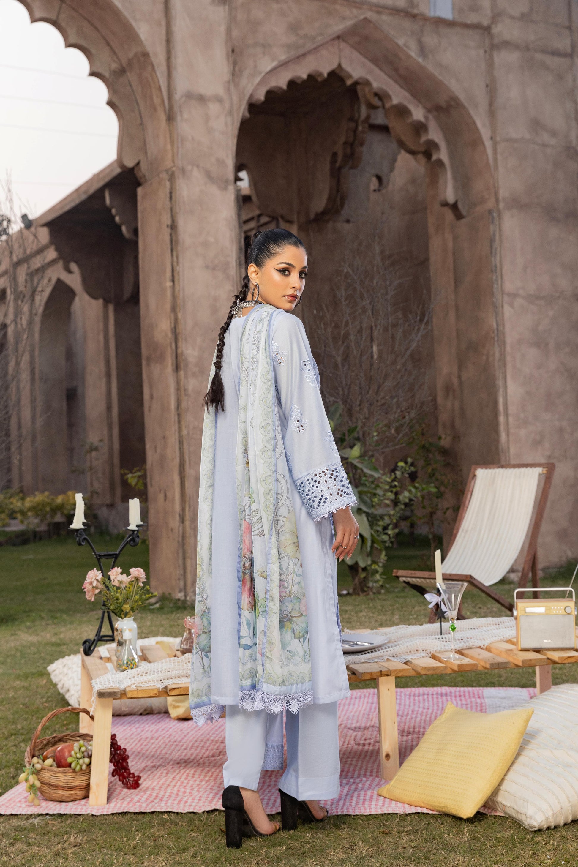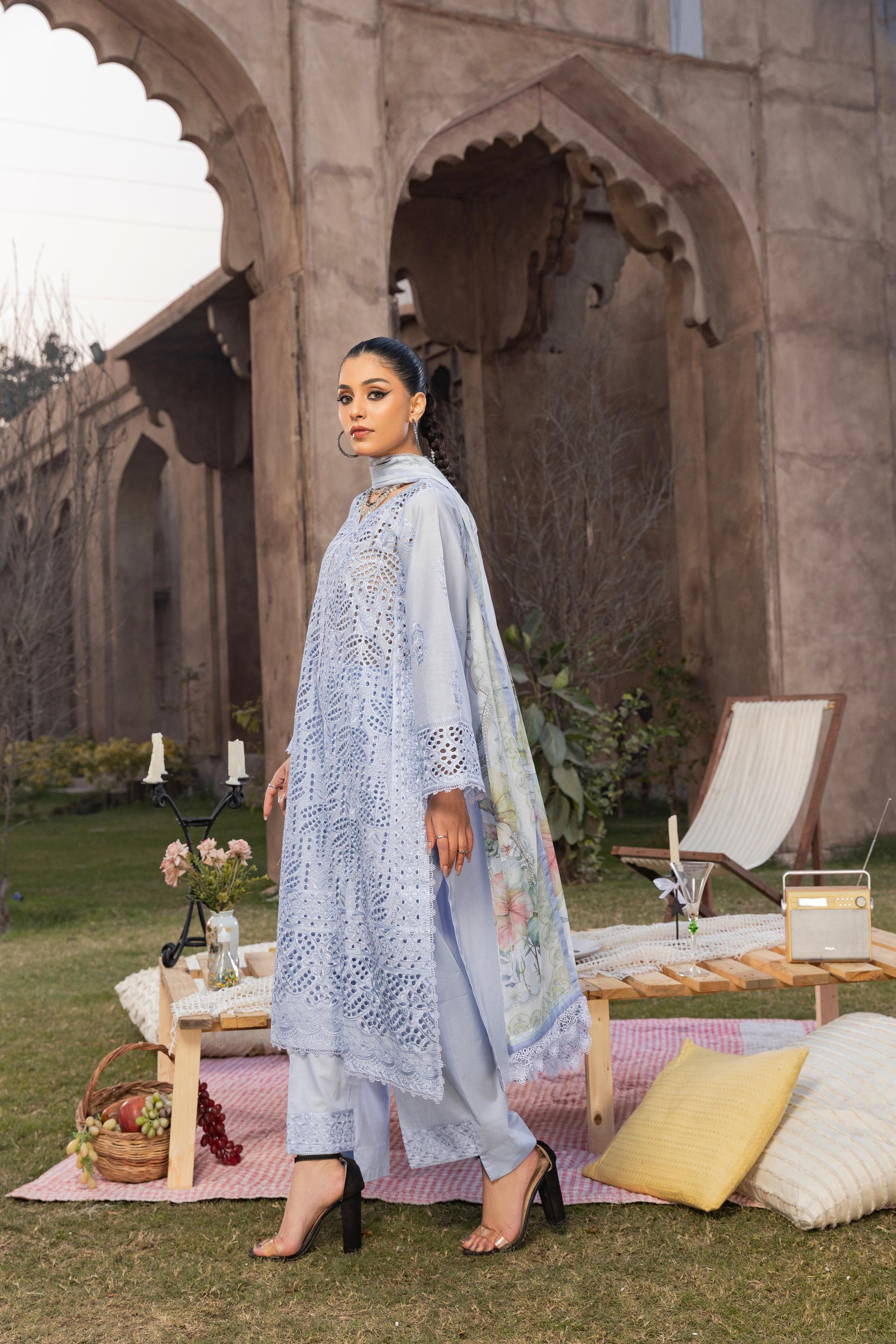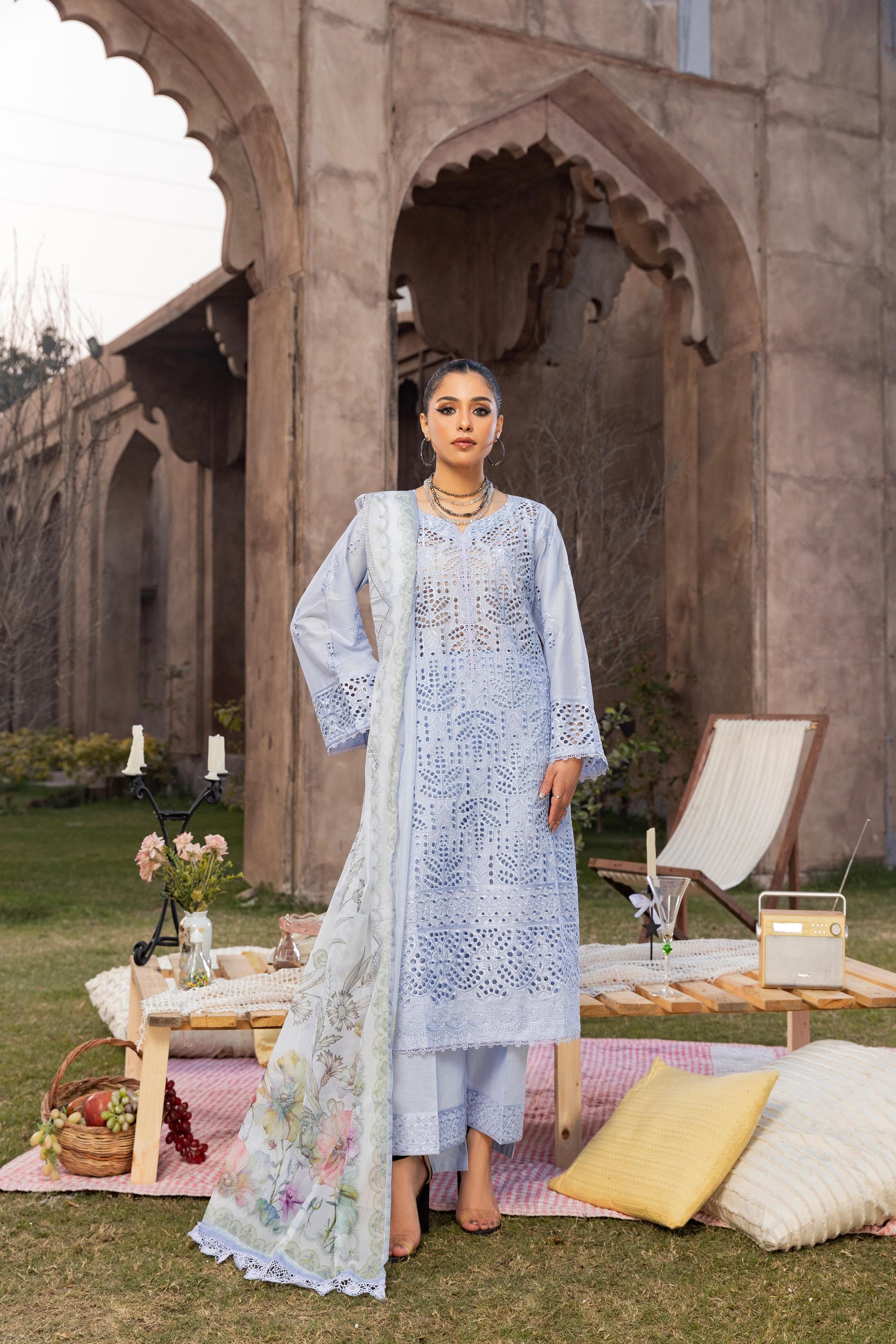 Nilgoon Dress features a beautifully schiffli lawn embroidered shirt paired with cotton embroidered trousers and a printed silk dupatta—perfect for a chic, confident, and elegant look.