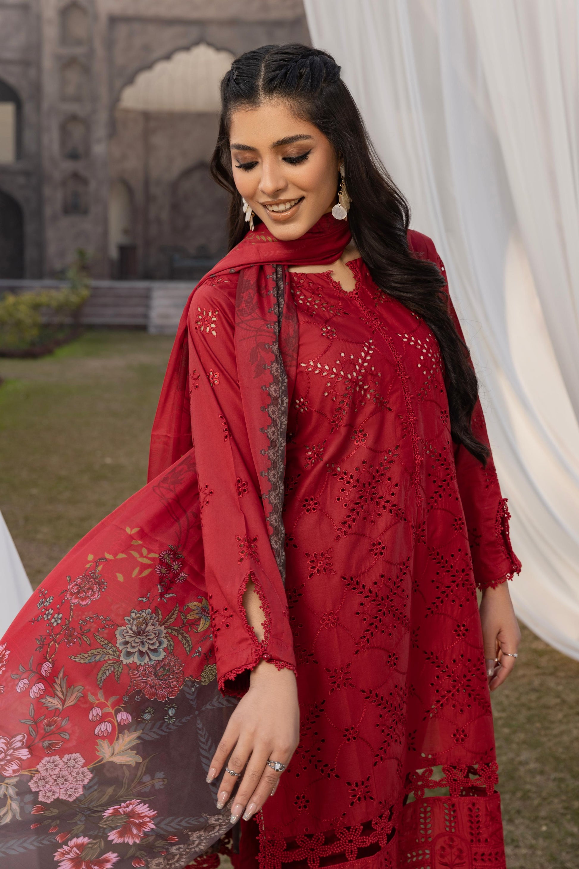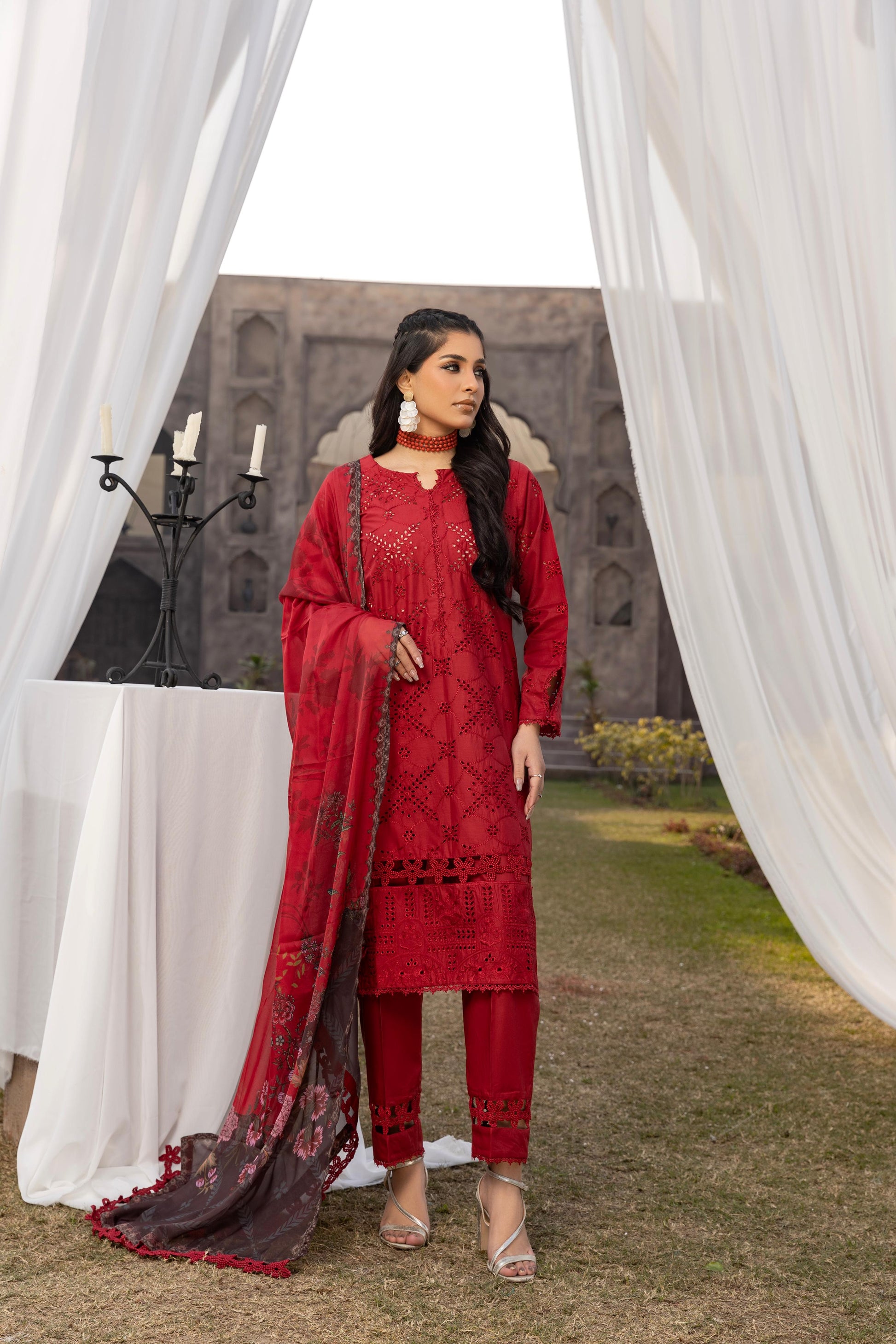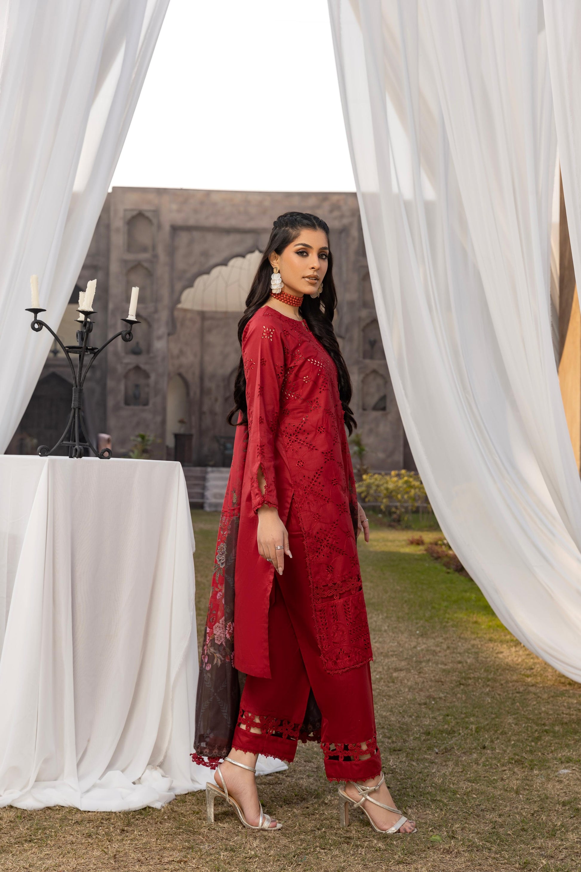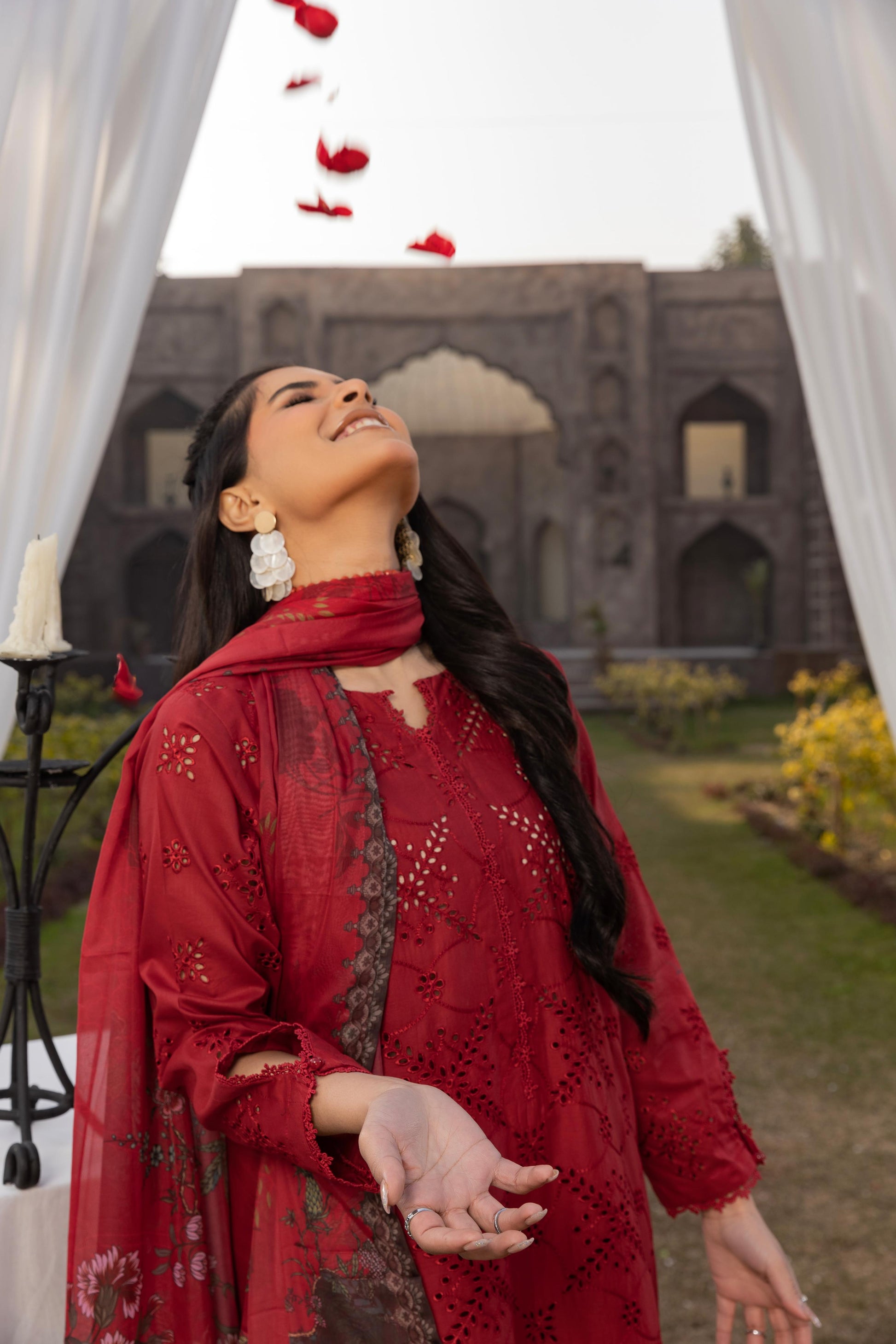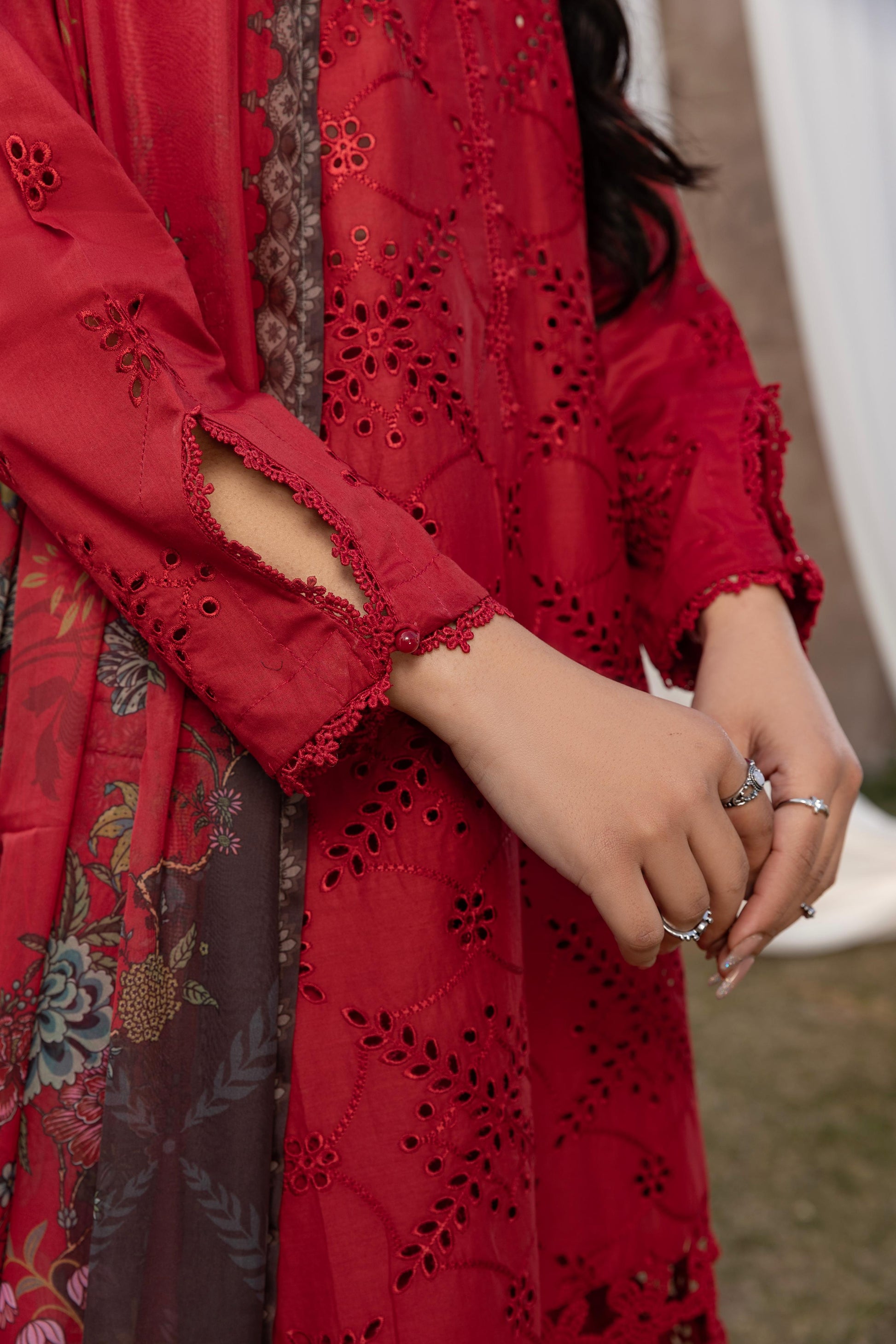 Qirmezi Dress features a finely schiffli lawn embroidered shirt paired with intricately cotton embroidered trousers and a printed silk dupatta—an elegant ensemble for a timeless and sophisticated look.